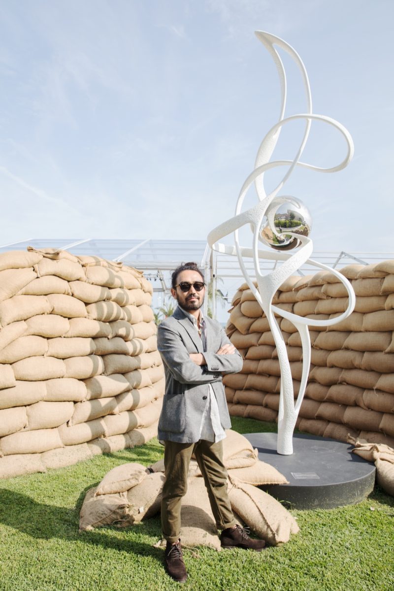 Aluk Amiri davanti a una delle installazioni di Gianfranco Meggiato, Il Giardino delle Muse silenti, 2017. Venezia, Hotel Excelsior, 8 settembre 2017
