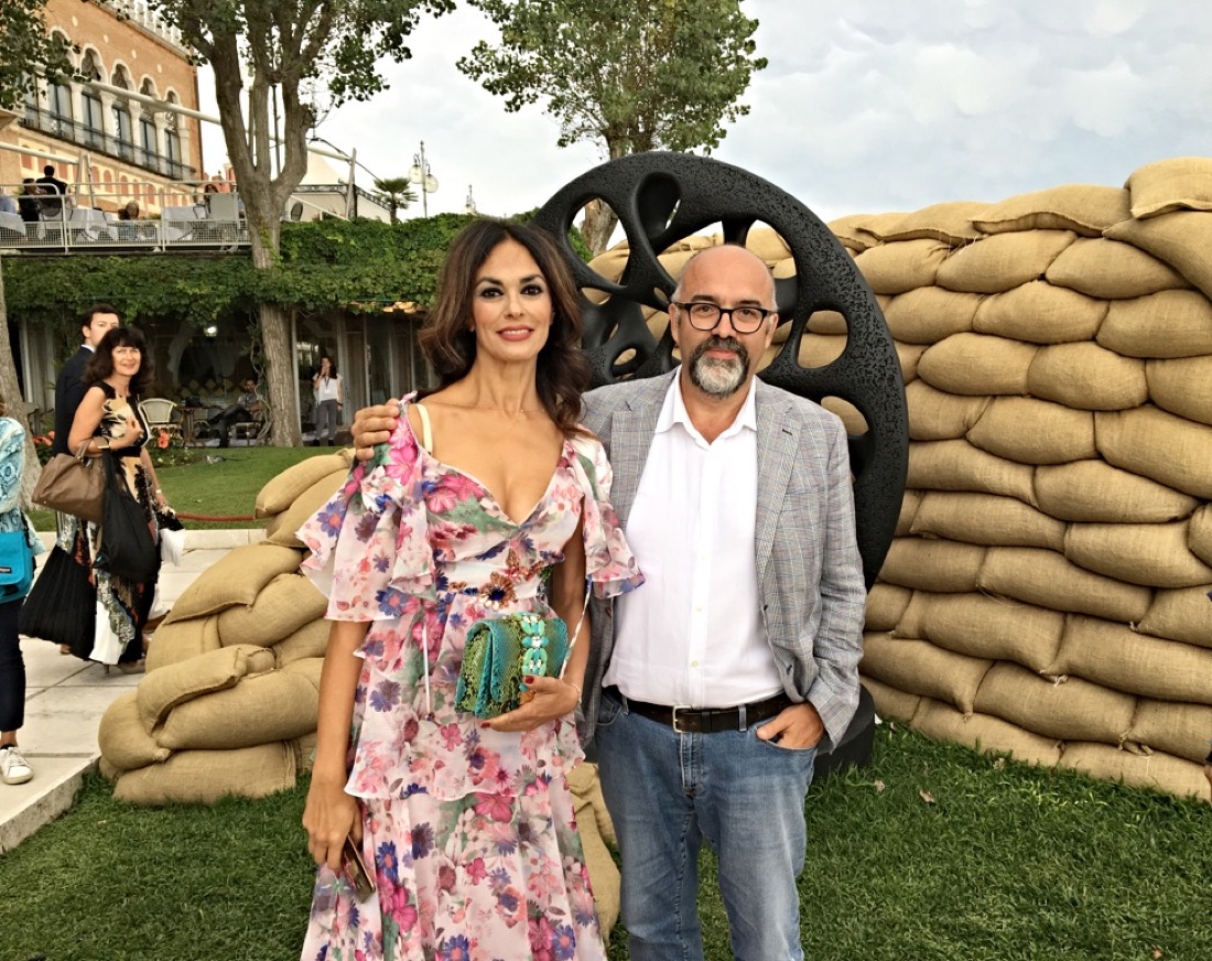 Maria Grazia Cucinotta con Gianfranco Meggiato davanti a una delle installazioni di Gianfranco Meggiato, Il Giardino delle Muse silenti, 2017. Venezia, Hotel Excelsio, settembre 2017