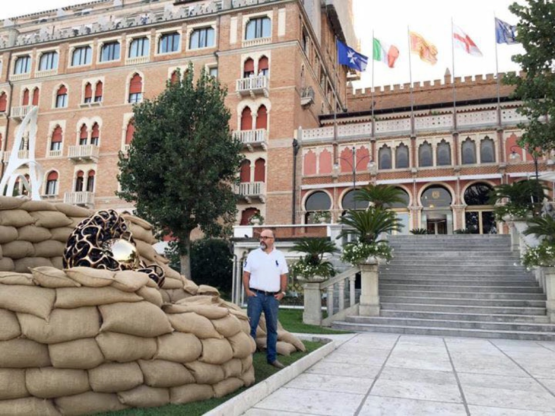 Lo scultore Gianfranco Meggiato davanti all’Hotel Excelsior con una delle sue sculture. Venezia, 3 settembre 2017