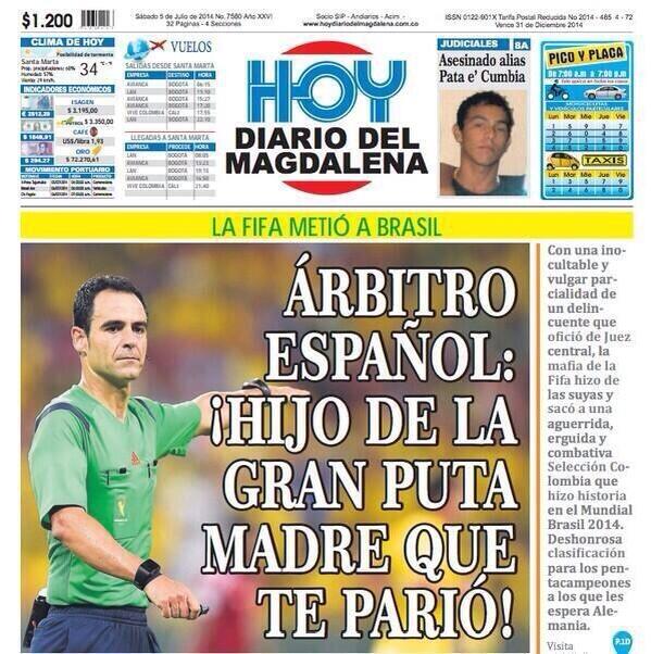 Come l’hanno presa in Colombia? Non benissimo, almeno a giudicare dalla prima pagina di Hoy, quotidiano che ha messo in grande evidenza l’arbitro della sfida contro il Brasile e gli ha riservato un insulto a nove colonne. ‘Arbitro spagnolo, figlio di quella grande p…. che ti ha messo al mondo!’ hanno letto i tifosi colombiani, nella gran maggioranza poco soddisfatti della direzione di gara e convinti che la Fifa abbia voluto favorire il Brasile padrone di casa. A parte Hoy, però, gli altri quotidiani colombiani hanno preferito puntare sui ringraziamenti alla nazionale di Pekerman, eliminata dopo un Mondiale da protagonista.