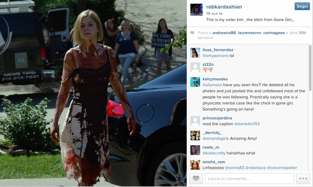 Astuta? Bugiarda? Vendicativa? Diabolica o assassina? Quale degli aspetti del carattere di Amy Dunnes, protagonista della pellicola Gone Girl (tratto dal best seller L’Amore bugiardo) secondo Rob Kardashian calzano meglio per la sorella Kim?