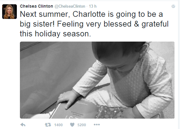 Hillary Clinton, impegnatissima nella campagna elettorale per le primarie democratiche negli Usa, aspetta un secondo nipotino per giugno. La figlia Chelsea ha infatti annunciato di aspettare un altro bebè e lo ha fatto (naturalmente) via social, con un post che ha raccolto in pochi minuti migliaia di commenti entusiasti: “Next summer, Charlotte is going to be a big sister! Feeling blessed & greatful this holiday season” ha scritto Chealsea su Twitter.