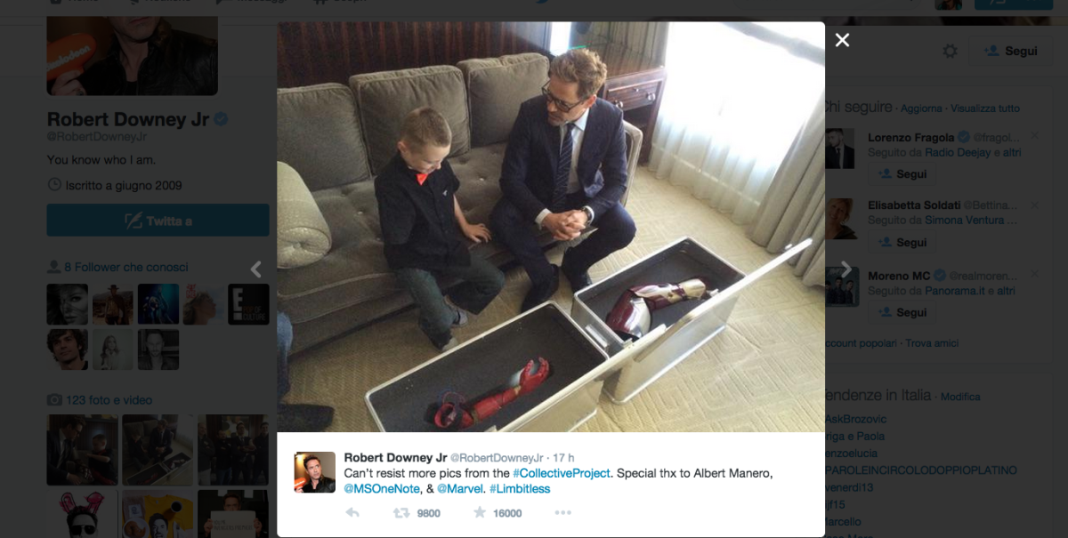 “Ho avuto il privilegio assoluto – ha spiegato l’attore – di presentare un nuovissimo braccio bionico scannerizzato in 3D ispirato ad Iron Man al piccolo Alex, il bambino di 7 anni più elegante che abbia mai conosciuto. Un ringraziamento speciale per la realizzazione ad Albert Manero, OneNote e #CollectiveProject per il loro lavoro su arti artificiali come questo che li rende più accessibili a famiglie con bambini”