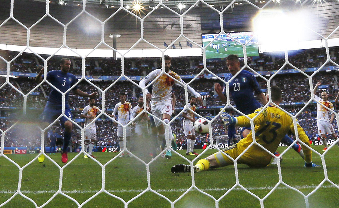 Inevitabile reazione della Spagna nel secondo tempo, con l’Italia a lungo schiacciata nella sua metà campo e incapace di chiudere la partita in contropiede con Eder al 55° (l’oriundo calcia su De Gea dopo aver bruciato tutta la linea difensiva spagnola), ma davvero in pericolo solo al 90°, quando Buffon si esibisce in una vera parata-miracolo deviando una conclusione ravvicinata di Piquet.
