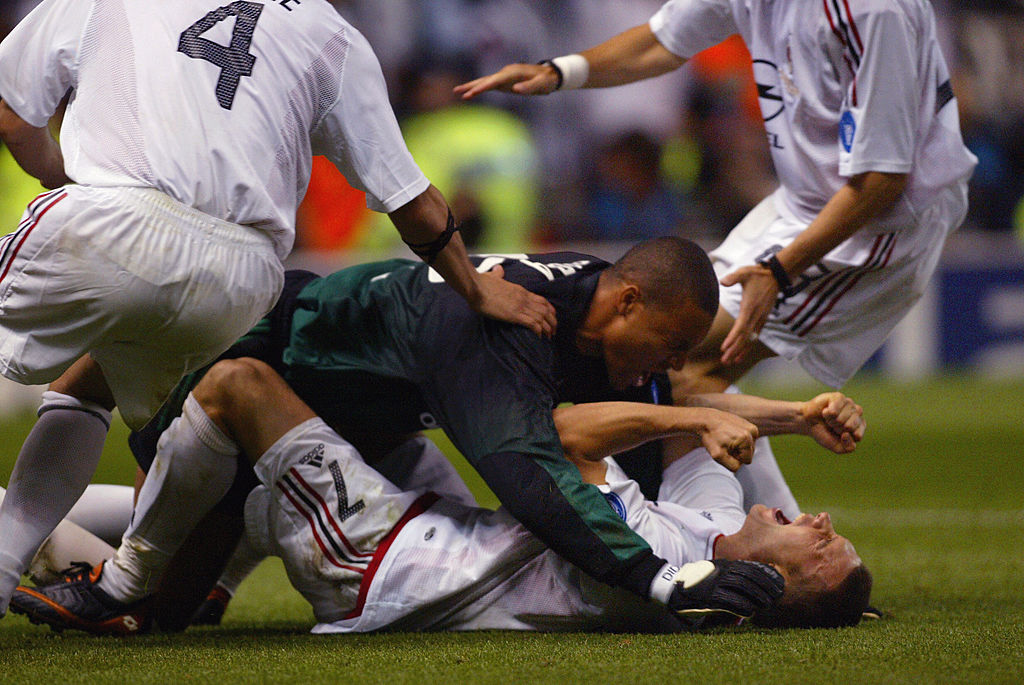 28 maggio 2003, Buffon in ginocchio dopo la sconfitta della Juventus nella finale di Manchester contro il Milan – 9 maggio 2017