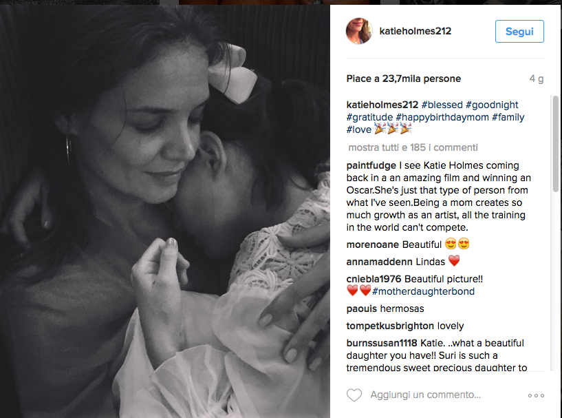 E per questo dal luglio di quell’anno la Holmes avrebbe condotto una vita tranquilla e ritirata dedicandosi a sua figlia Suri che non vede il padre da almeno tre anni.