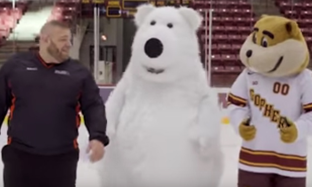 Si tratta dei ciak scartati durante le riprese della nuova pubblicità di White Bear Mitsubishi, concessionaria di automobili attiva in Minnesota, negli Stati Uniti. La povera mascotte ha infatti enormi problemi a non scivolare sul ghiaccio di un campo da hockey.
