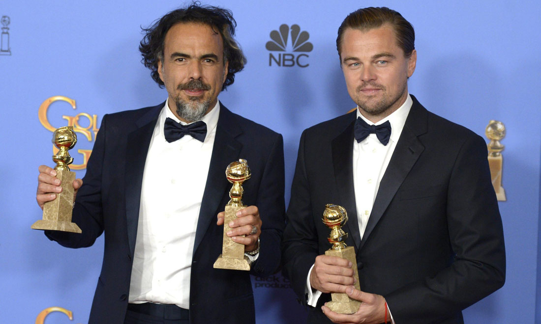 epa05096581 Mexican director Alejandro Inarritu (L) and US actor Leonardo DiCaprio hold the awards for Best Director, Best Motion Picture Drama and Best Actor Drama for ‘The Revenant’ in the press room during 73rd Annual Golden Globe Awards at the Beverly Hilton Hotel in Beverly Hills, California, USA, 10 January 2016. EPA/PAUL BUCK