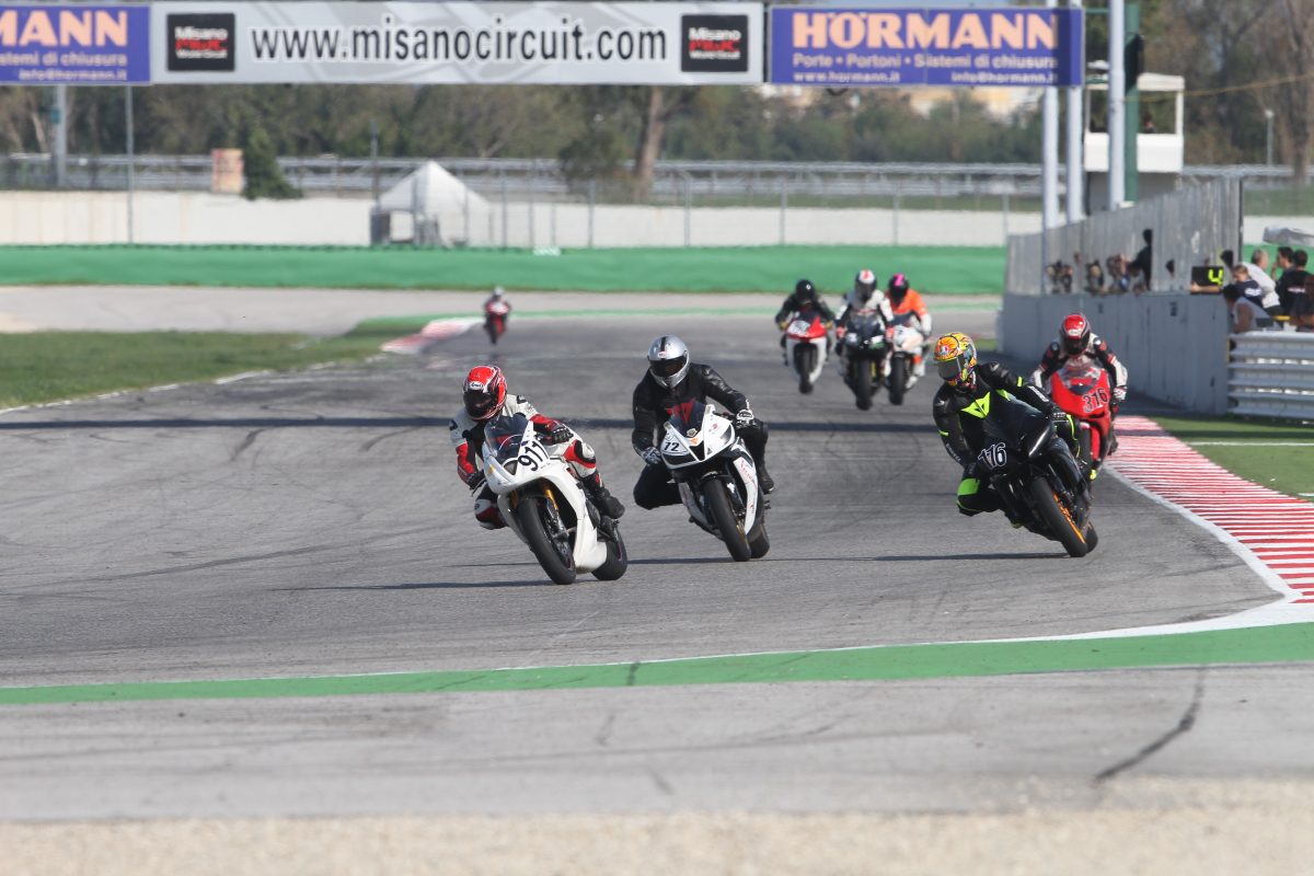 Si parte. Manzi guida il plotone. Il gruppo lo segue compatto, ben ligio al regolamento che vieta di sorpassare la moto che precede. In uscita dalla Quercia diamo volutamente una manata di gas per sondare il grip. Il posteriore ha un accenno di derapata, segno che l’asfalto deve ancora scaldarsi un po’. Procediamo ordinati dietro al nostro trenino di avversari. Curvone, Carro. In uscita dalla Misano, in pieno rettilineo, al centro della carreggiata c’è una moto sdraiata a terra. Bandiera gialla. Il pilota, fortunatamente, in piedi, ma non si può proseguire. I commissari sventolano la bandiera rossa che ci obbliga a rientrare ai box.