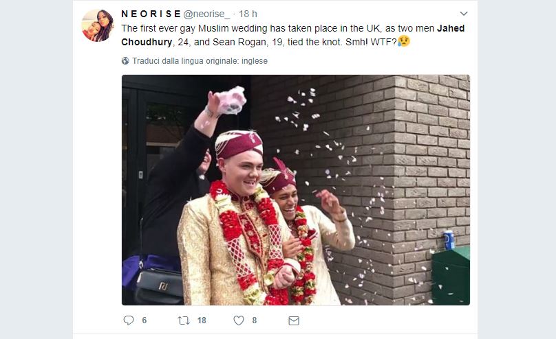 Al rito – celebrato a Wallsall nella zona delle Midlands occidentali in Inghilterra – i due innamorati erano da soli: le rispettive famiglie li hanno allontanati, ma ora loro non hanno più paura: “Voglio mostrare alla gente che non mi interessa – ha spiegato Jahed – la mia famiglia non ha voluto partecipare al matrimonio non hanno voluto vedermi, per loro è imbarazzante.