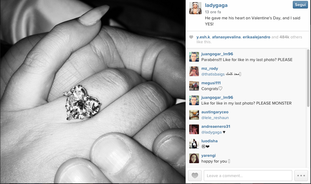 “Mi ha donato il suo cuore e io gli ho detto sì”. Così, via Instagram, Lady Gaga ha annunciato il fidanzamento con il compagno Taylor Kinney, attore e modello che l’artista frequenta dal 2011.