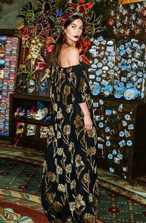 Lily Aldridge ha indossato un abito lungo in velluto di seta nero e oro della Pre-Collezione Autunno/Inverno 2016 di Rochas durante il gala “Save Venice: Un Ballo in Maschera” a New York