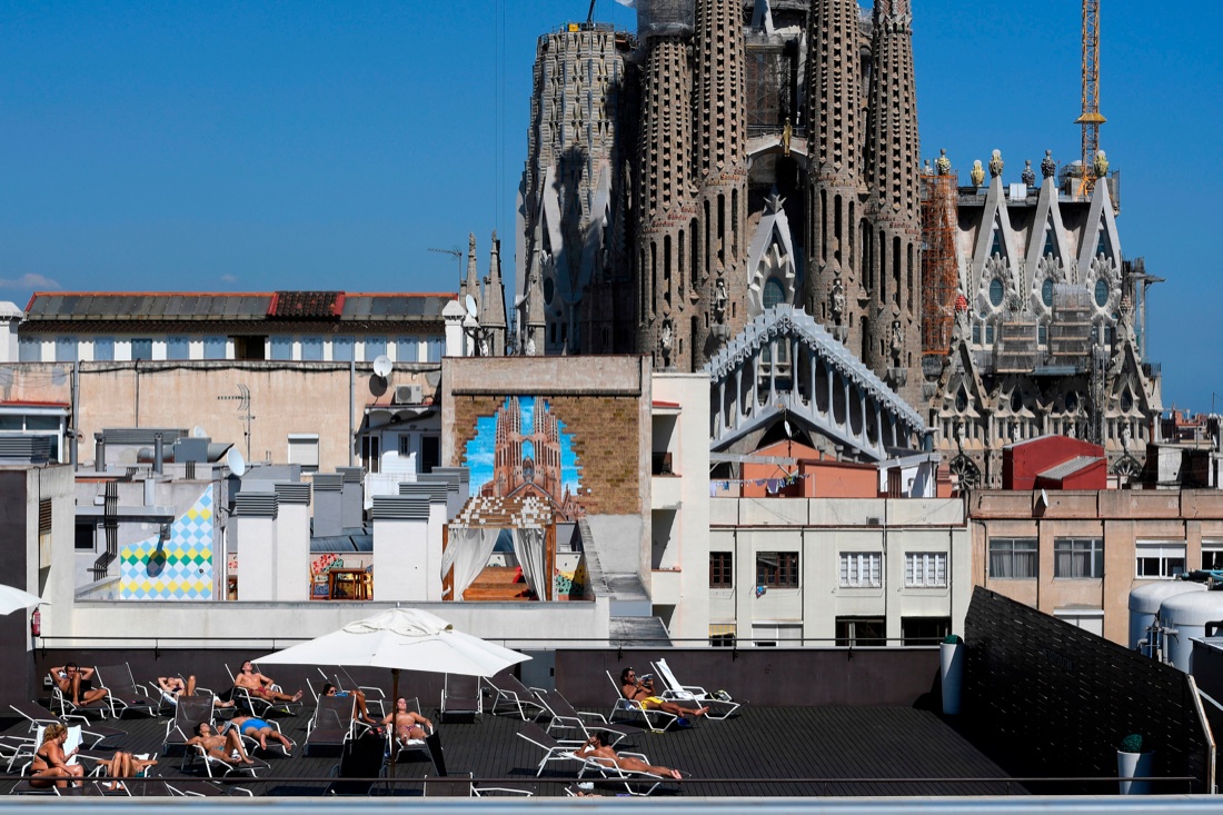 La Sagrada Familia fa da sfondo ai turisti sul solarium. 5 settembre 2017