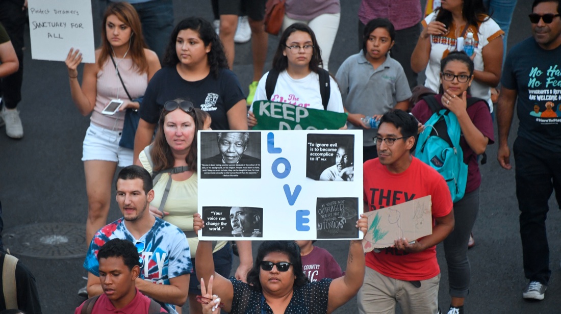 Los Angeles, 5 settembre. Immigrati e attivisti protestano per la decisione di sospendere il DACA sui figli degli immigrati da parte dell’amministrazione Trump.