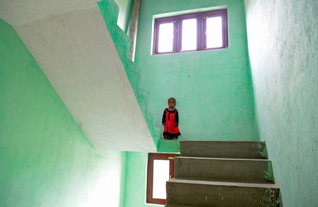 Un piccolo rifugiato Rohingya sulle scale di un centrodi accoglienza in Bangladesh il 14 settembre