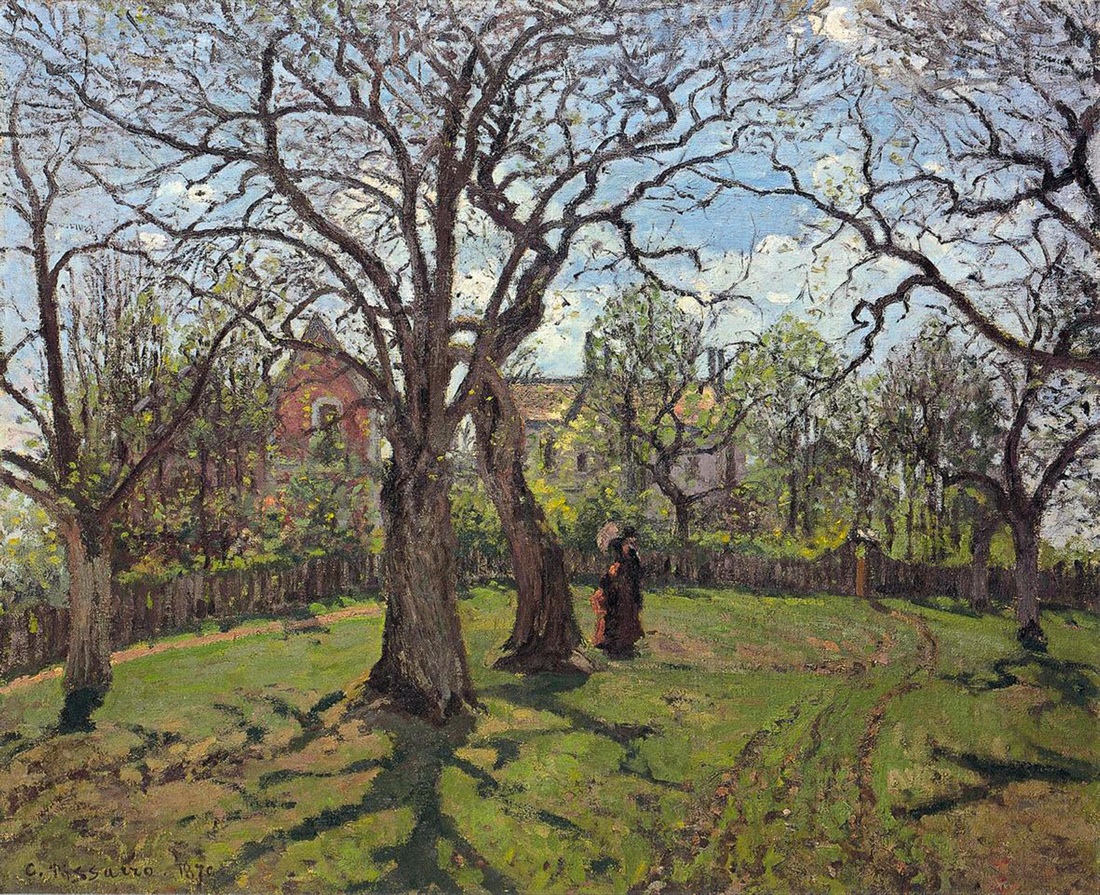 Castagni a Louveciennes, Primavera, olio su tela di Camille Pissarro (1870)