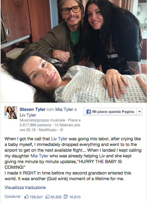 Accanto a Liv, al momento del parto, c’era la sorella Mia e proprio mentre il piccolo veniva al mondo è arrivato il nonno-bis. Il leader degli Aerosmith, che ha scoperto di essere padre di Liv solo quando lei aveva 11 anni grazie ad un’intuizione della ragazza che ha notato un’incredibile somiglianza con la (si scoprirà) sorella Mia, ha espresso tutta la sua emozione su Facebook dove ha scritto. “Quando mi hanno chiamato dicendomi che Liv era entrata in travaglio, dopo aver pianto come un bimbo, ho lasciato perdere tutto quanto e sono andato all’aeroporto per prendere il primo volo disponibile. Quando sono atterrato ho chiamato mia figlia Mia che era già lì ad aiutare Liv e mi ha tenuto aggiornato minuto per minuto sul travaglio fino a quando ho sentito la frase: ‘Corri, il bambino sta per nascere!’. Ho fatto giusto in tempo ad entrare poco prima che il mio nipotino nascesse. È stato un altro momento della mia vita per cui ringrazio Dio”.