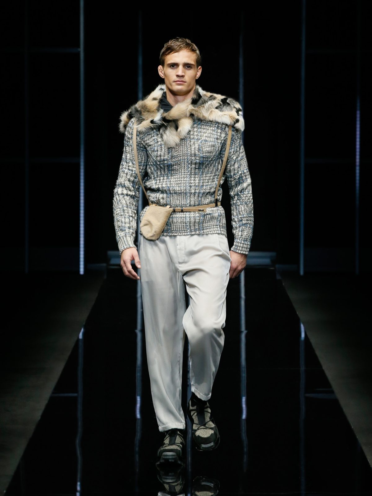 L’uomo di Emporio Armani è pragmatico e sportivo, vive in città ma appena può fugge negli spazi senza confine, in mezzo alla natura. Impegnato, attivo non disdegna l’ozio della vita all’aria aperta. Ha scarpe di pelo e si copre di pellicce ma sintetiche, voluminose, ricche, dall’aspetto selvaggio ma pur sempre eco. Nel rispetto della Natura che tanto ama. Cardature, lacerature, doppiature rendono materica la collezione che presenta una palette di colori perfettamente armaniana fatta di Bianchi ottici, bianchi freddi, note di grigi dalla patina brinata con qualche accenno di blu e di rosso. E se il pantalone morbido chiuso al fondo è ormai un lei motiv delle collezioni maschili di Armani, i volumi decisi di cappotti e di giubboni sono un’interessante novità.