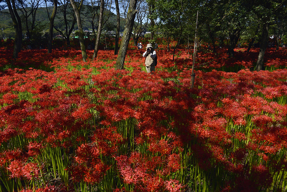 Nelle foto di Franck Robichon, i circa 5 milioni di Lycoris radiata in fiore nel parco Kinchakuda Manjushage di Hidaka, nella Prefettura di Saitama, in Giappone. Chiamato in giapponese “manjushage ” o “higan-bana” (perché fiorisce nel periodo della festa buddhista di higan, celebrata nella settimana intorno agli equinozi), questo fiore veniva tradizionalmente piantato ai bordi dei campi di riso e ortaggi e nei cimiteri, perché, avendo radici velenose, teneva lontani gli animali dai campi e dalle salme. La sua fioritura segna in terra nipponica la fine dell’estate e l’arrivo dell’autunno.