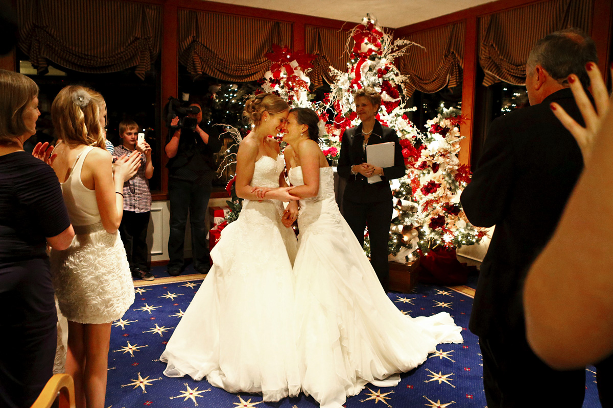 Un mega matrimonio: sono stati in 1.600 (800 coppie in tutto) a dire “sì” tutti insieme proprio nel giorno dell’entrata in vigore della legge che legalizza il matrimonio gay nello Stato di Washington. Allo scoccare della mezzanotte, Sarah e Emily Cofer, due insegnanti di scuola elementare, sono state le prime a promettersi amore eterno di fronte ad un giudice di un tribunale locale nella contea di Seattle. Altre due neo-spose, Robin e Danielle, vestite in giacca bianca con rosa all’occhiello, hanno spiegato: ”Il nostro rapporto è più forte che mai, ora che è anche riconosciuto dallo Stato. E speriamo che un giorno questo succeda in tutto il Paese”.