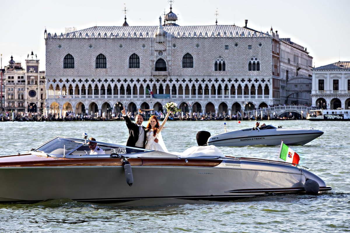 Hanno preso in ostaggio Sting, interrompendo la sua tournée mondiale. Il celebre cantante è stato fatto arrivare in gran segreto da Los Angeles, poi è rimasto chiuso per tre giorni nella stanza di un lussuoso hotel di Venezia: era essenziale per evitare che qualcuno notasse la sua presenza in Laguna. Infine, si è esibito per un’ora al culmine della festa, diventando il regalo a sorpresa per la sposa. Che, assieme alle damigelle, è salita sul palco per intonare il brano Desert Rose, in coro con il suo beniamino.