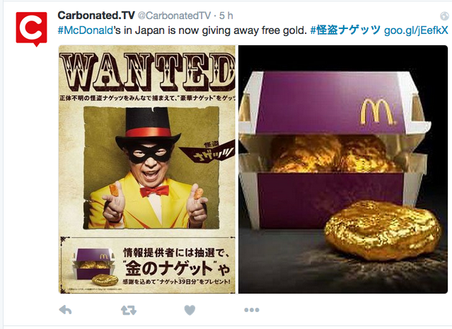 I clienti che lo avvistano devono subito condividere via social network l’evento con l’hashatag dedicato #怪盗ナゲッツ, che significa Kaito Nuggets in giapponese.