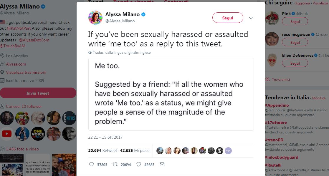 A lanciare la catena diventata in poche ore virale è stata l’attrice Alyssa Milano che ha scritto: “Se tutte le donne molestate sessualmente o violentate scrivessero Me too come status, potremmo dare alle persone un senso della vastità del problema”.