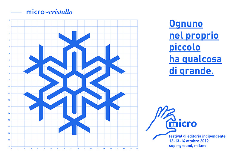 Organizzato da La Caffettiera (progetto coordinato da Marco Nicotra di BOLO Paper e Giuliana Tammaro di BRANCHIE ) e prodotto in collaborazione con ArtKitchen , MICRO si terrà nelle giornate del 12, 13 e 14 ottobre, a Milano, presso lo spazio Superground (via Bussola 4). Ventitrè gli editori selezionati provenienti dall’Italia e dall’estero: 0-100 (IT), Aalphabet (IT), AKV Berlin (DE), BOLO Paper (IT), Canicola (IT), Celeste (IT), Cesura Publish (IT), Delebile (IT), Emidio Bernardone (IT), Eric Winkler (DE), Gloria Glitzer (DE), Lök (IT), Nurant (IT), Mekanik Copulaire (FR), Print about me (IT), Solo ma non troppo (FR), Spheres (CH), Strane Dizioni (IT), Talkinass (IT), TBooks Cologne (DE), Topipittori (IT), Troglodita Tribe (IT), Zweizehn (DE).