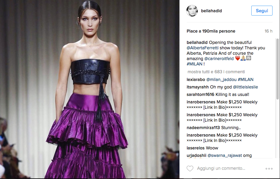 Bella Hadid, invece, ha sfilato per Alberta Ferretti mentre l’italiana Vittoria Ceretti per Versace. Tra le giovani leve della moda nostrana da tenere d’occhio sono anche Greta Varlese (Cavalli) e Matilde Rastelli (Ferretti) oltre all’onnipresente Chiara Ferragni.