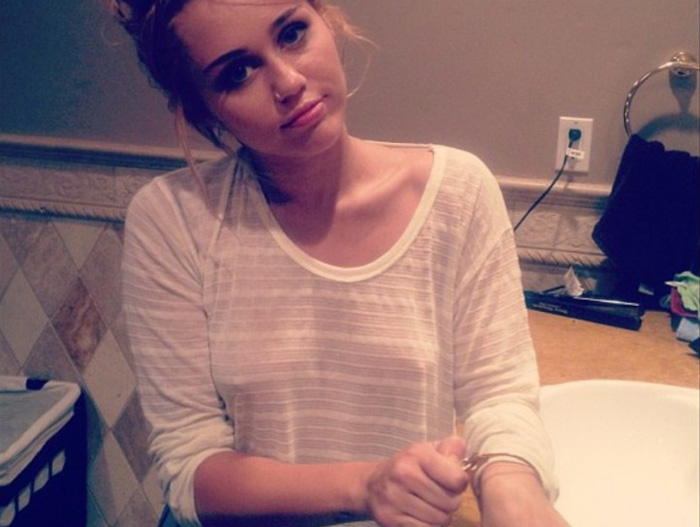 Tutto questo spiega come mai la foto pubblicata su Istagram (la vedi qui sotto) abbia fatto tanto rumore. Per fortuna sta semplicemente mostrando un braccialetto a forma di manetta, come ha sottolineato anche il portavoce della cantante. Tra l’altro, c’è chi ha stemperato la tensione sostenendo di non aver fatto caso al polso di Miley Cyrus, perché distratto dal fatto che non indossa il reggiseno.