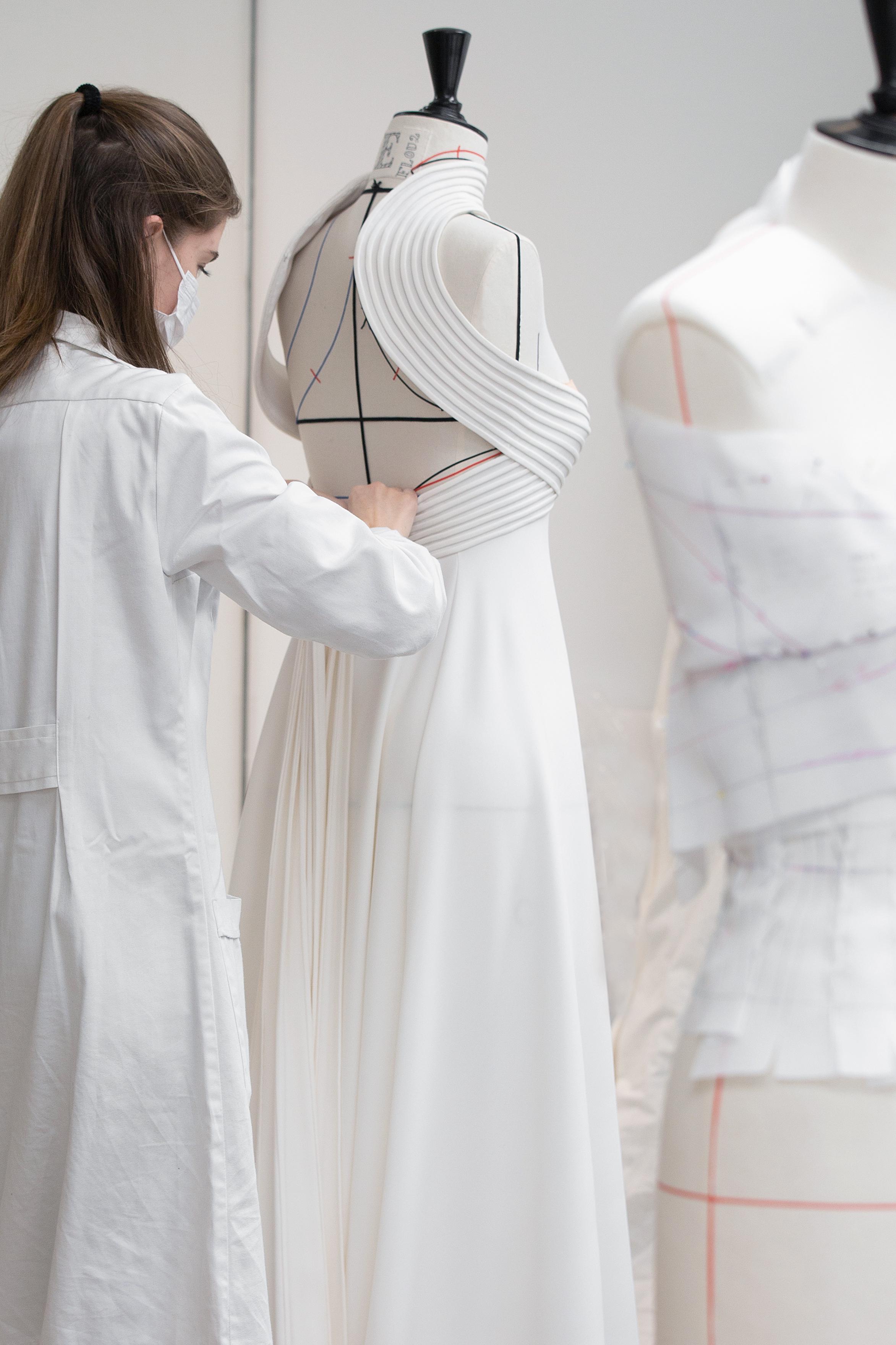 Per la Chiuri, l’atelier è un luogo sacro, «un concetto “diffuso” che comprende centinaia di persone». E altrettante ore di lavoro. Per la creazione di alcuni look, come l’abito senza spalline nero e quello con il collo all’americana ne sono servite rispettivamente 270 e 220. Così come per i due abiti bianchi, dai corpetti impunturati e architettonici che hanno richiesto 320 e 260 ore di manodopera.