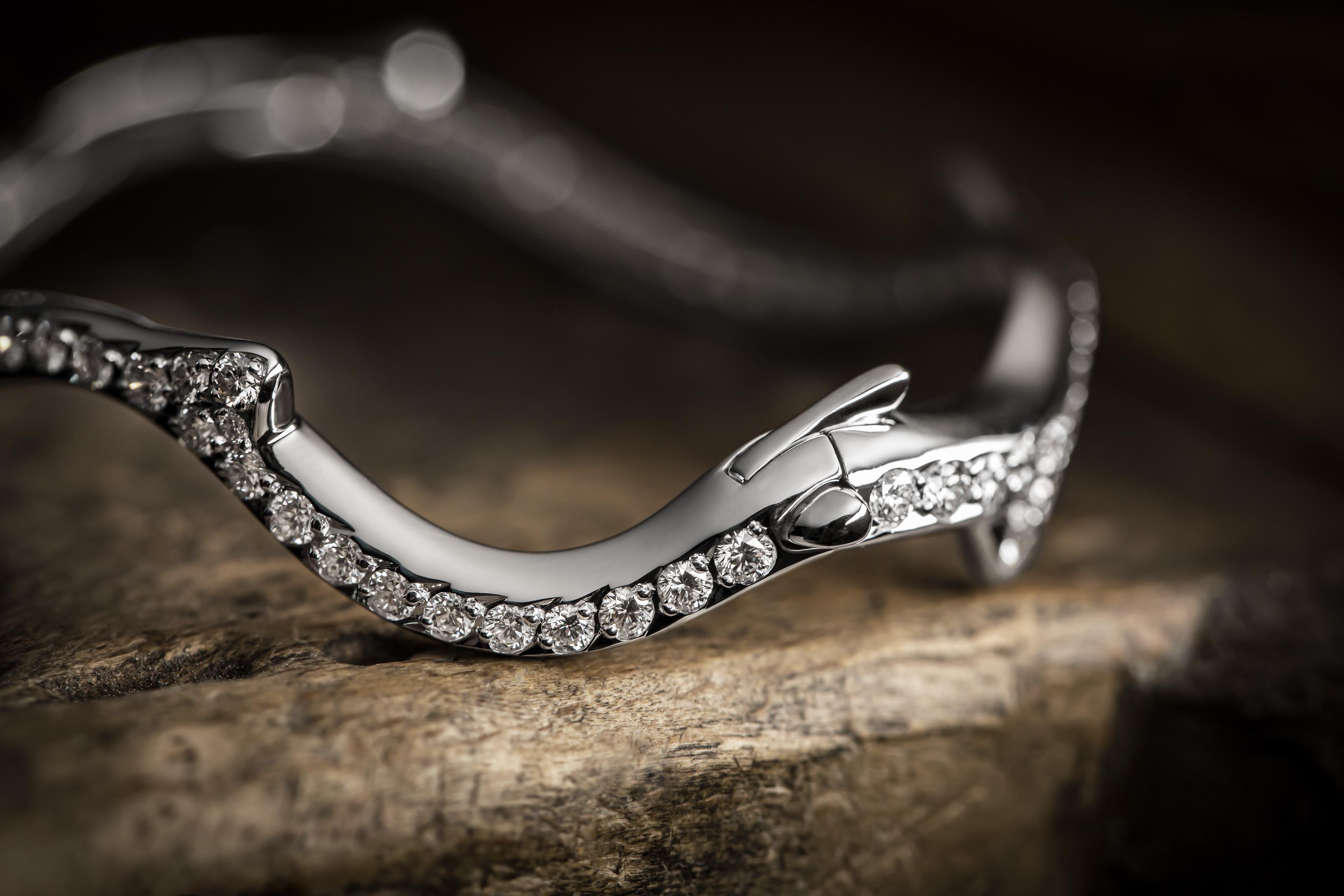 Il gambo della rosa, scolpito in oro bianco tempestato di diamanti, cinge così il polso in versione bracciale. Per crearlo sono servite tecniche innovative che richiedono diverse fasi meticolose di produzione, dalla fusione alla lucidatura, dalla timbratura all’incastonatura, riflettendo la bellezza del gesto dell’artigiano. La creazione della chiusura richiede poi una precisione particolare, in modo che possa essere discretamente nascosta tra le spine, esemplificando il savoir-faire, l’attenzione al dettaglio e l’insuperabile standard di eccellenza che sono così cari alla Maison.