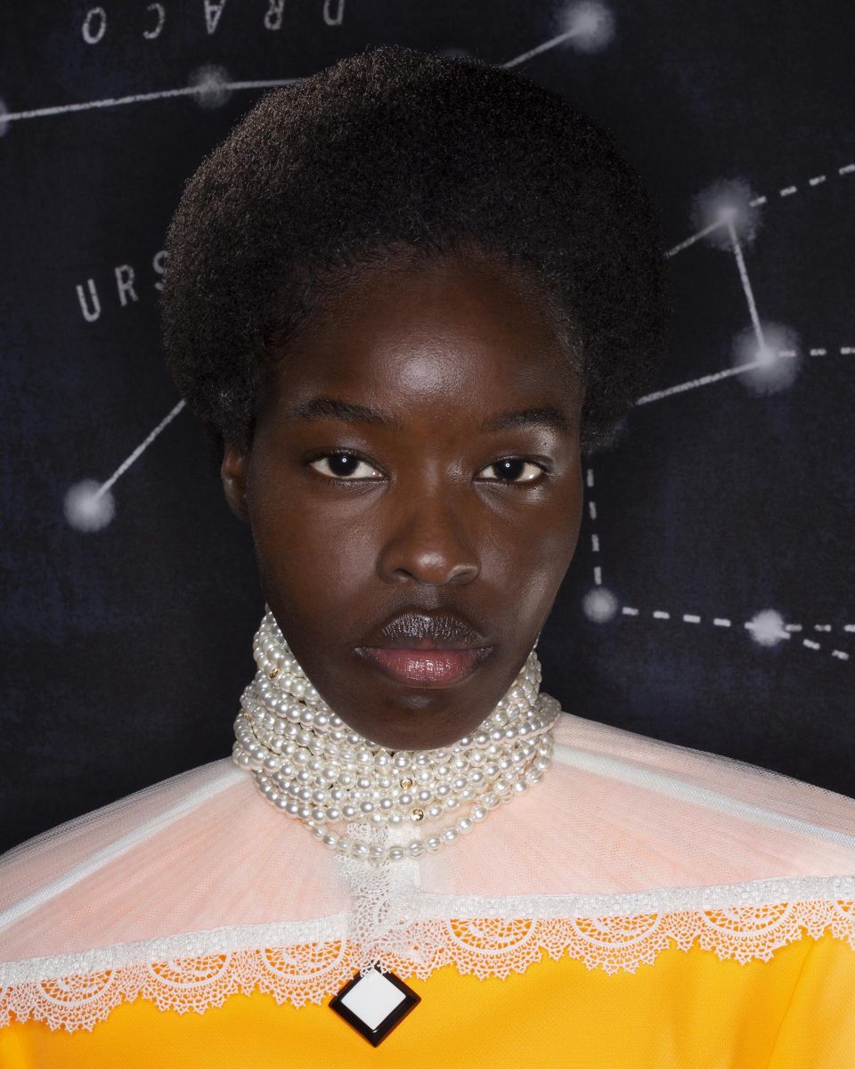 I distintivi make-up, curati da Thomas de Kluyver – global make-up consultant di Gucci Beauty – sono caratterizzati da zigomi rosati e labbra rosse audaci, ma anche da dettagli inaspettati come le lacrime glitterate che rigano il viso di alcuni modelli.
