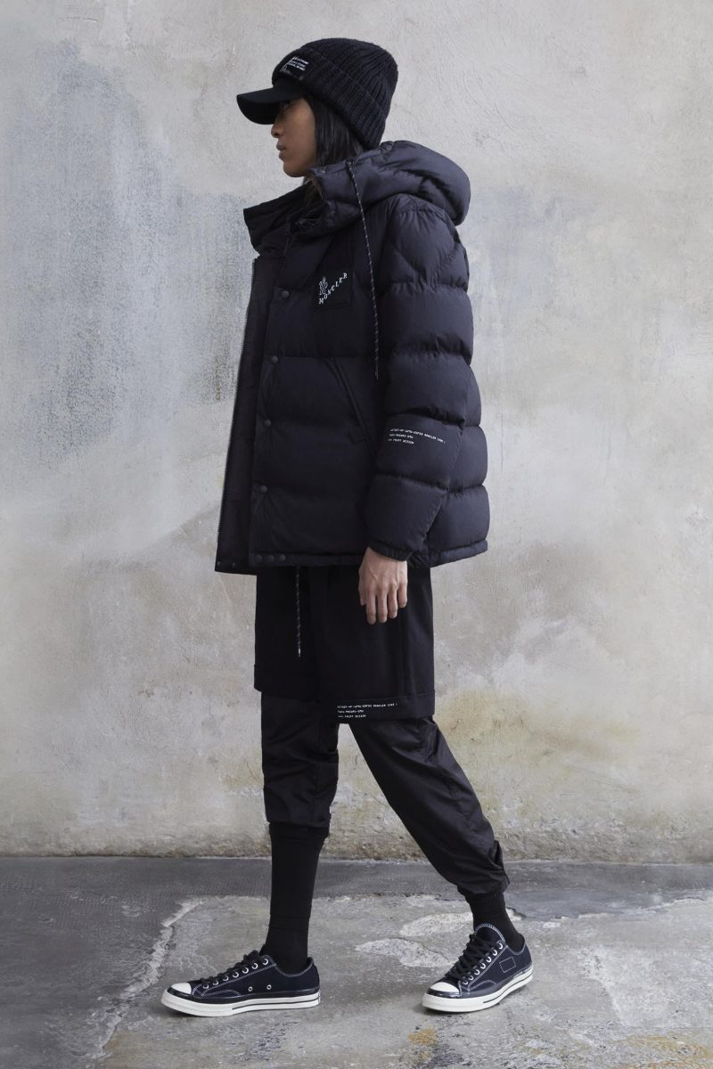 Lo slogan della stagione, «World of Moncler», compare sul retro o nei dettagli, insieme all’acronimo del designer, WOM, può essere letto anche sottosopra, a rafforzare il legame di Fujiwara con il brand.
