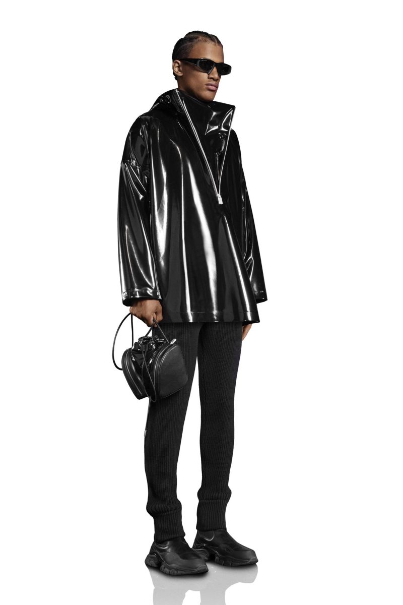 I piumini seguono la silhouette del corpo, mescolandosi a calda lana performante, oppure si accorciano e alternano alla mantella kway ultra lucida. I pantaloni sono atletici e affusolati, abbinati a maglie zippate, talora tagliate sopra l’ombelico.