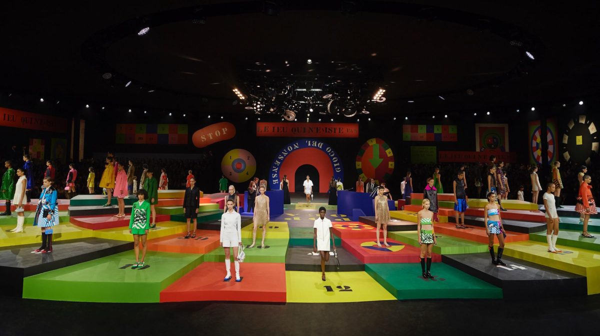 Ripercorrendo i momenti salienti di questa settimana non si può che cominciare con la presentazione della collezione Dior, ospitata in una surreale ricreazione di un enorme gioco dell’oca, ribattezzato Il Gioco del Nonsense, immaginato dall’artista Anna Paparotti, all’interno del quale le modelle hanno atteso il proprio turno per muoversi, come fossero pedine. Maria Grazia Chiuri ridefinisce una nuova estetica per Dior, tra block color vitaminici e geometrie precise in bilico tra ispirazioni anni Sessanta e dinamiche street culture di matrice anni Novanta.