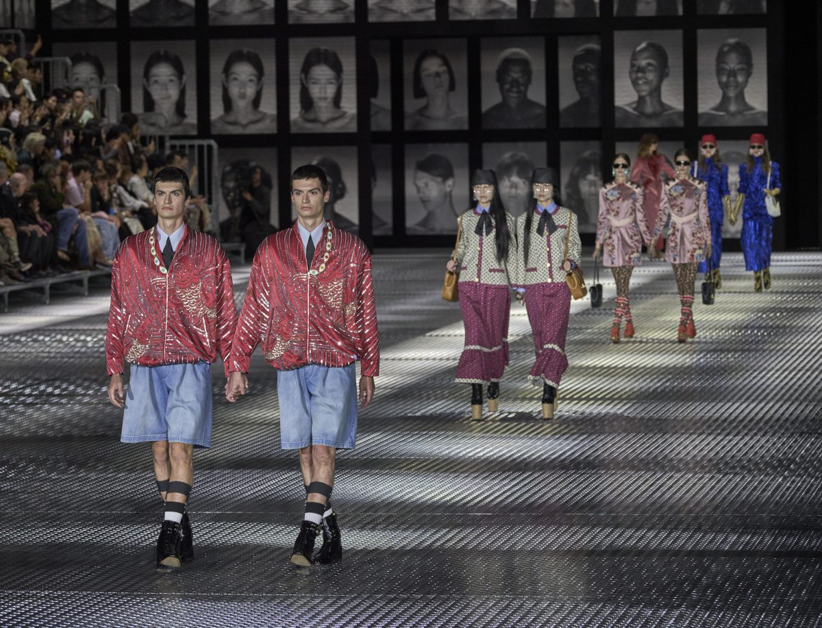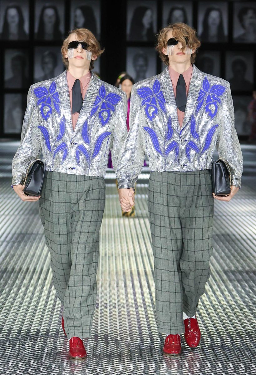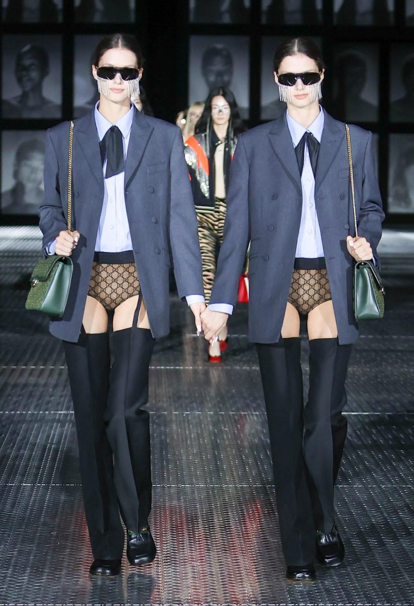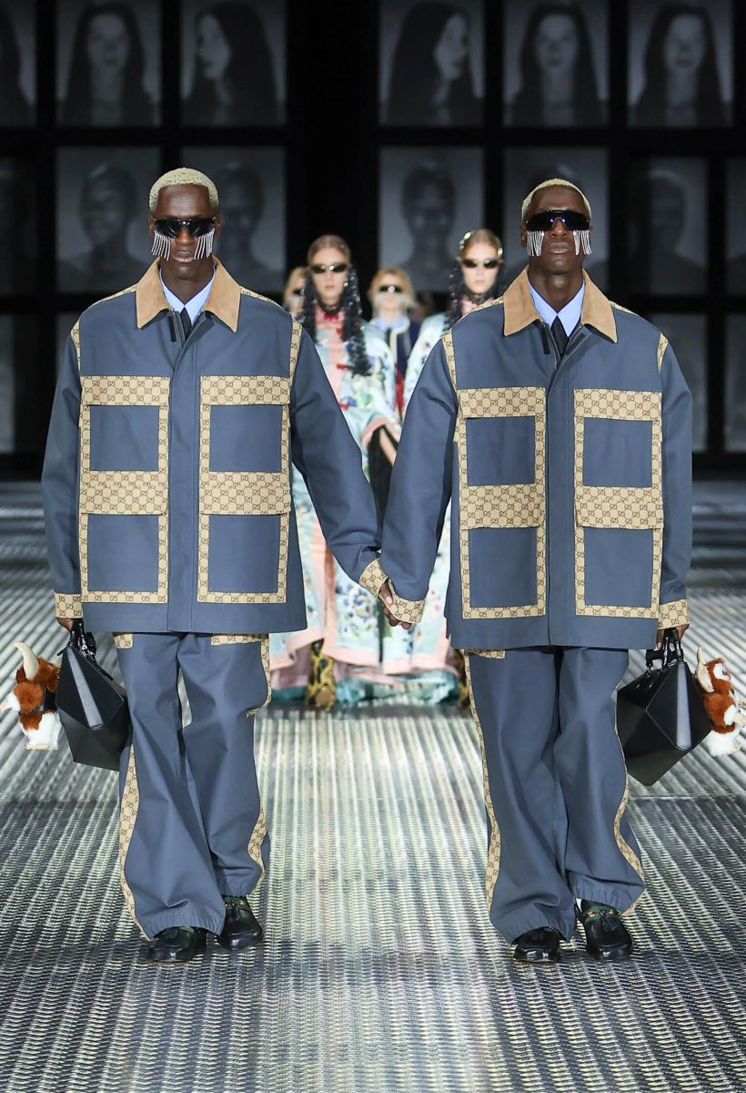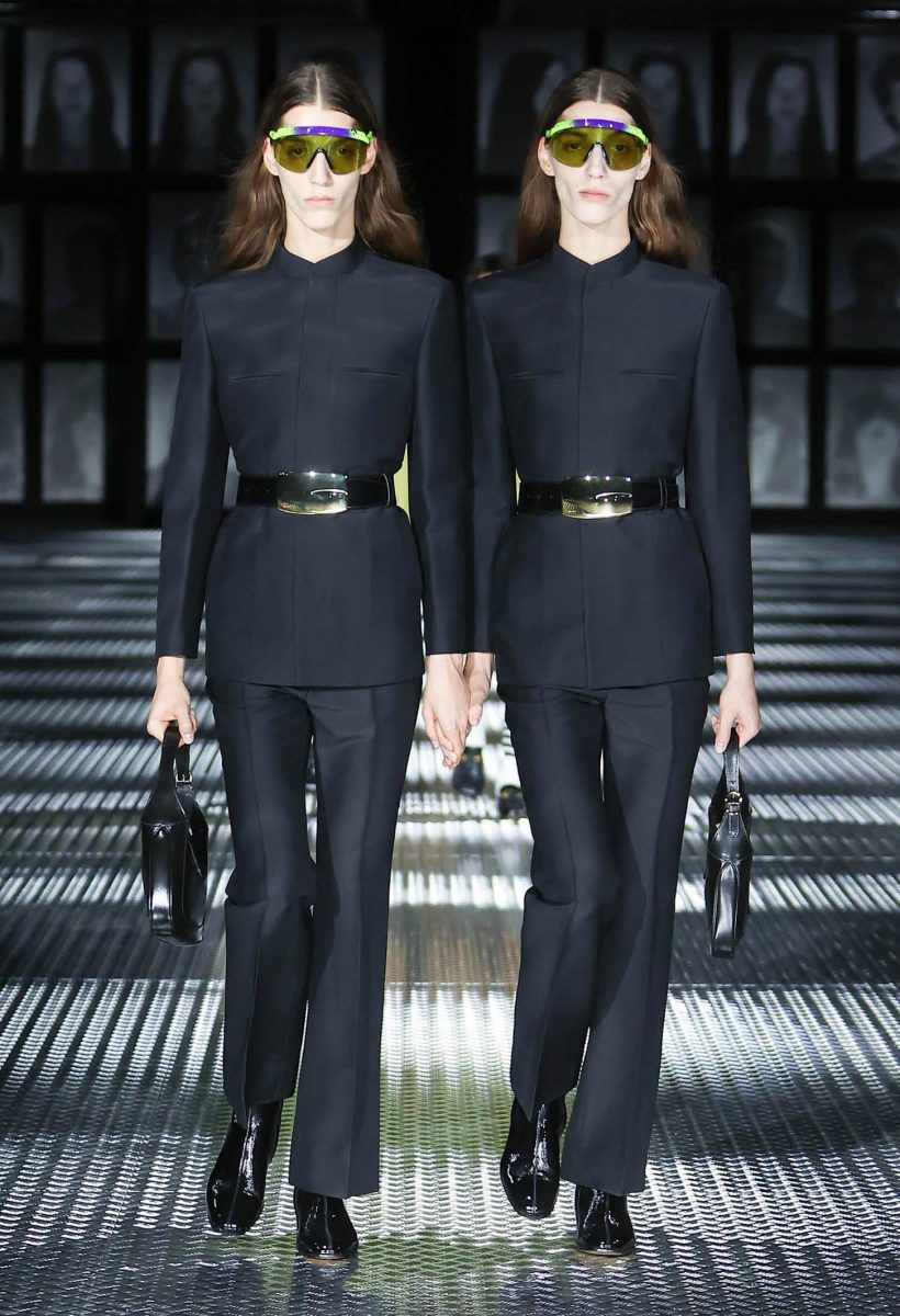 È in onore delle due donne – entrambe scomparse – che l’ultima sfilata di Gucci esplora cosa significhi il termine «individualità» e come la natura gemellare presenti un «ossimoro perturbante che sollecita a pensare che non tutto è quel che sembra». La passerella si anima così di 68 coppie di gemelli che sfilano insieme, tenendosi per mano, con outfit perfettamente identici.