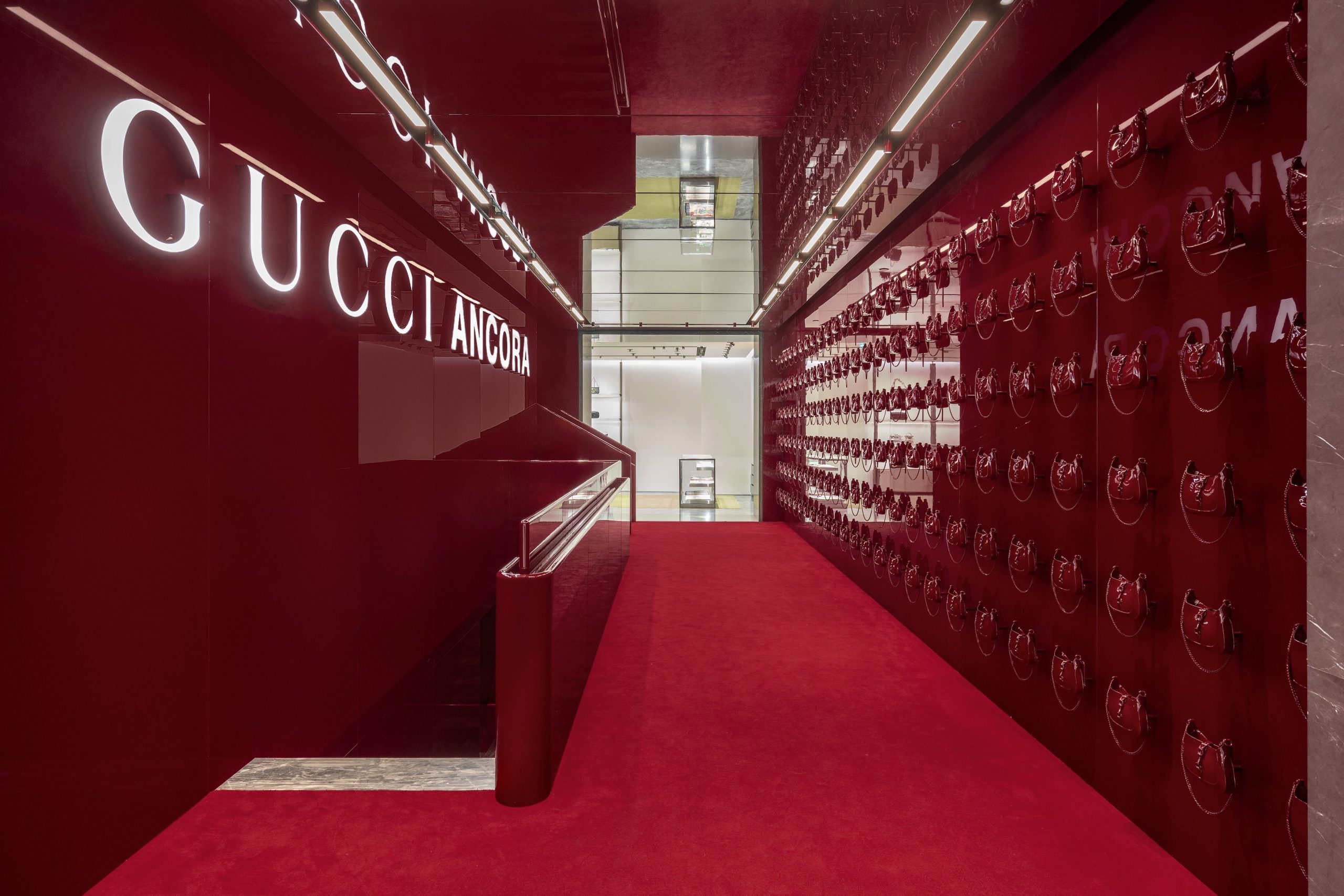 Con oltre 1.800 metri quadrati distribuiti su due piani, la boutique ospita prêt-à-porter uomo e donna, borse, bagagli, scarpe, seta, occhiali, gioielli, fragranze e altro ancora. Il negozio introduce anche due lounge separate per una esperienza dedicata. Il piano terra è dedicato agli articoli in pelle, mettendo in mostra le linee di borse iconiche della Maison. Una parete retroilluminata in alabastro bianco espone una selezione di borse Jackie Notte e di slingback Gucci Signoria, della collezione Gucci Ancora. Allo stesso modo, un’altra parete espositiva attira l’attenzione su preziosi carré in seta con la storica stampa Flora, che continua a conferire alle collezioni Gucci un’atmosfera romantica sin dagli anni Sessanta.