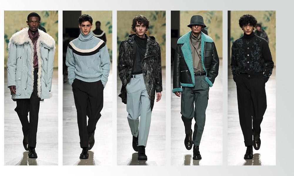L’eleganza urbana propone cappotti doppiopetto e abiti che slanciano la silhouette in stile Savile Row in flanella di lana tinta unita o rigata, dai quali spuntano le camicie lucide con collo alto in modalità new dandy.
