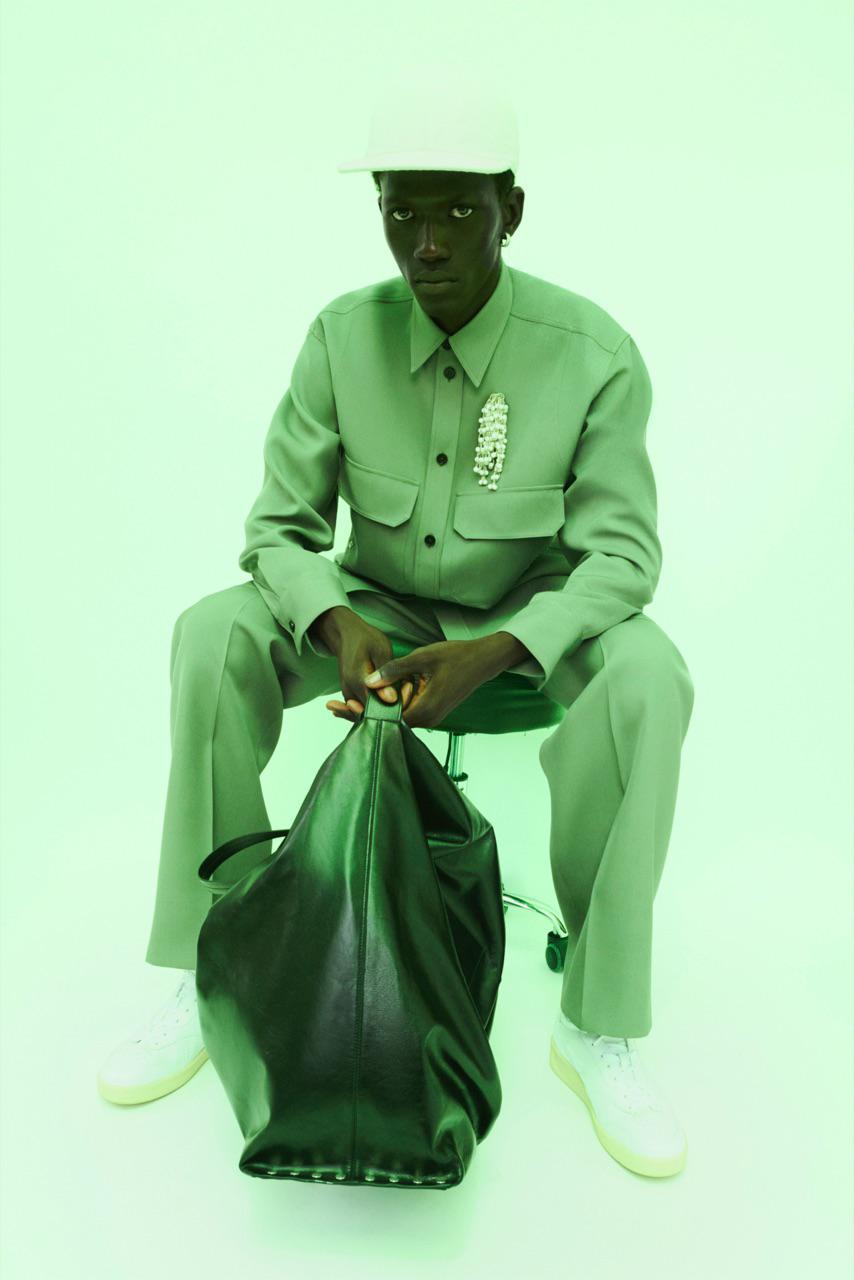 E tutta la gamma di accessori aiuta l’ingegnoso corredo dell’insieme, come lo zaino bicolore e bimaterico, borse e marsupi tattili e rigonfi, anfibi, desert boots e sneakers, architettonicamente ricostruiti.