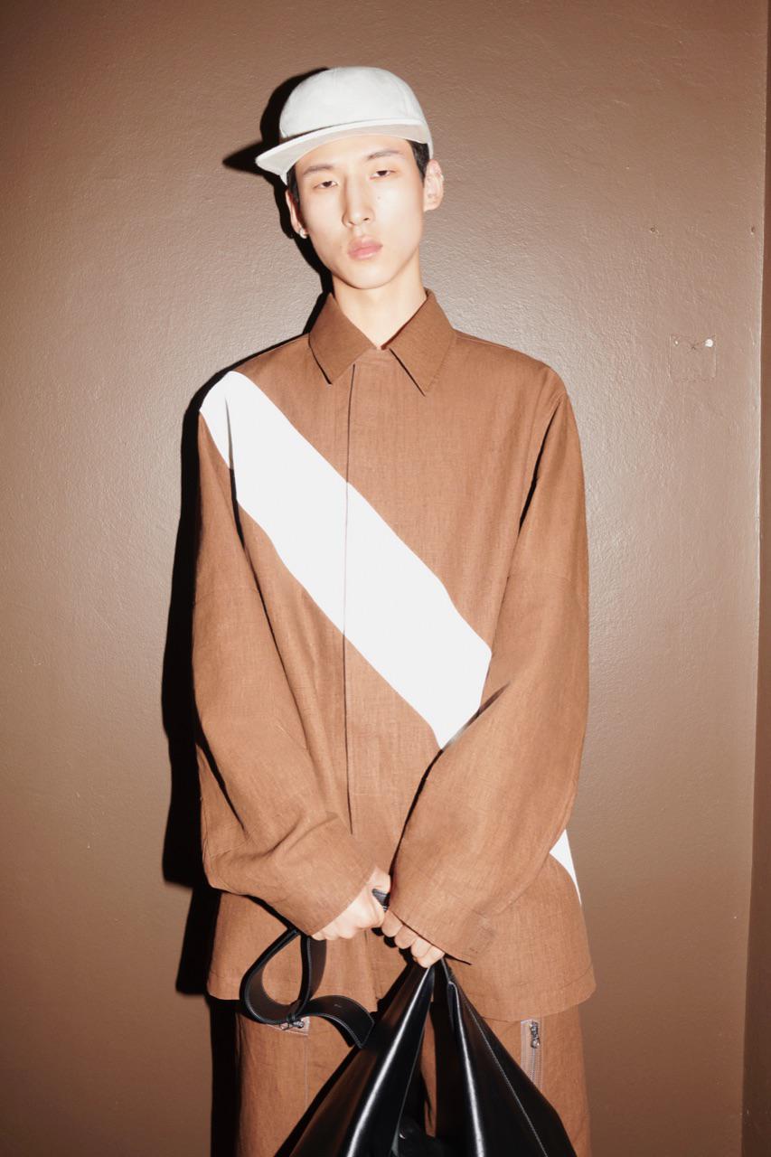 I capospalla, giacche e cappotti di matrice giapponese, sono dritti, grafici; così come i coordinati camicia e pantalone con tasche utility segnati da una striscia diagonale sul davanti.