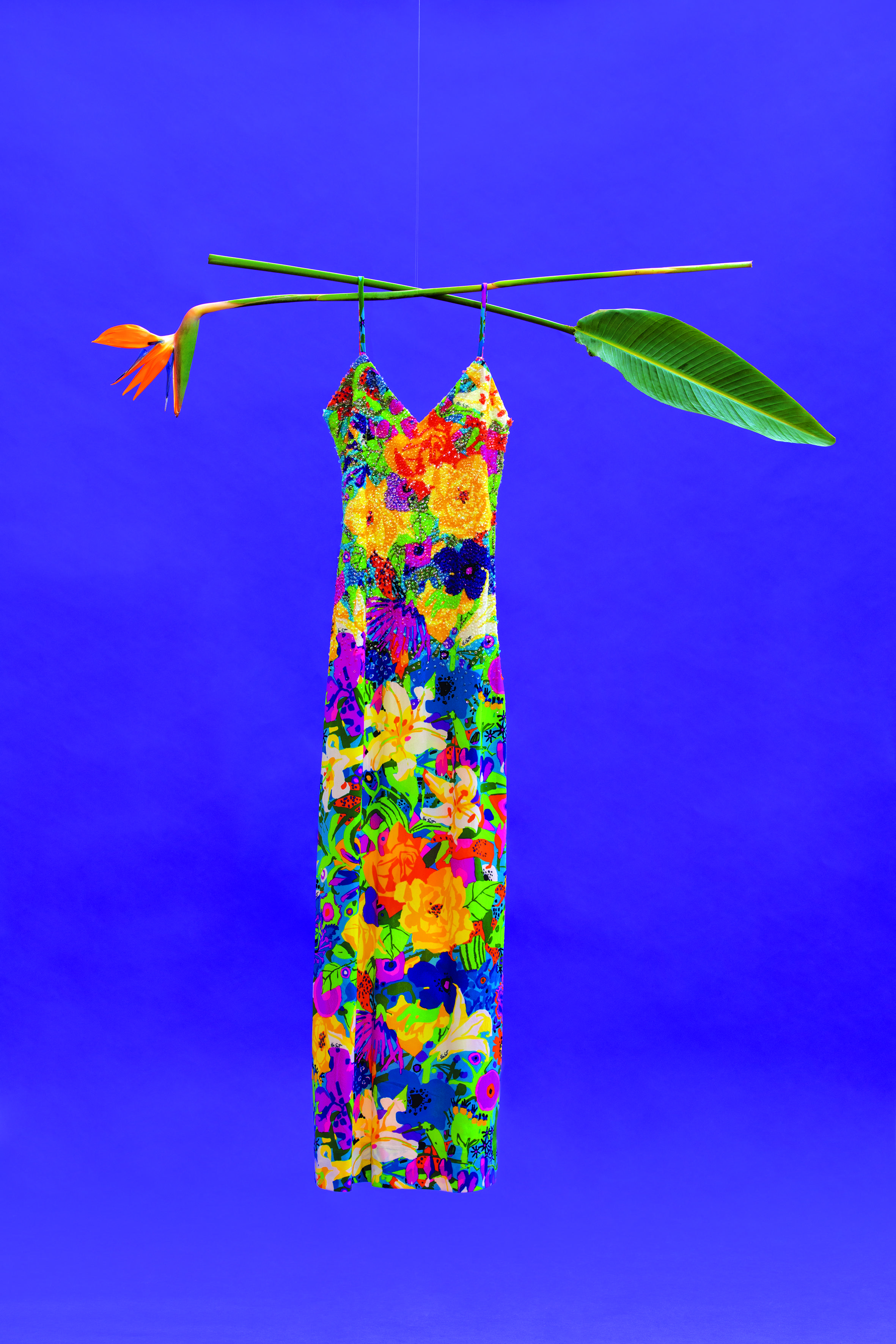Abito lungo in Ban-Lon con corpetto ricamato di paillettes con disegno Elia (1973) (Guido Taroni)