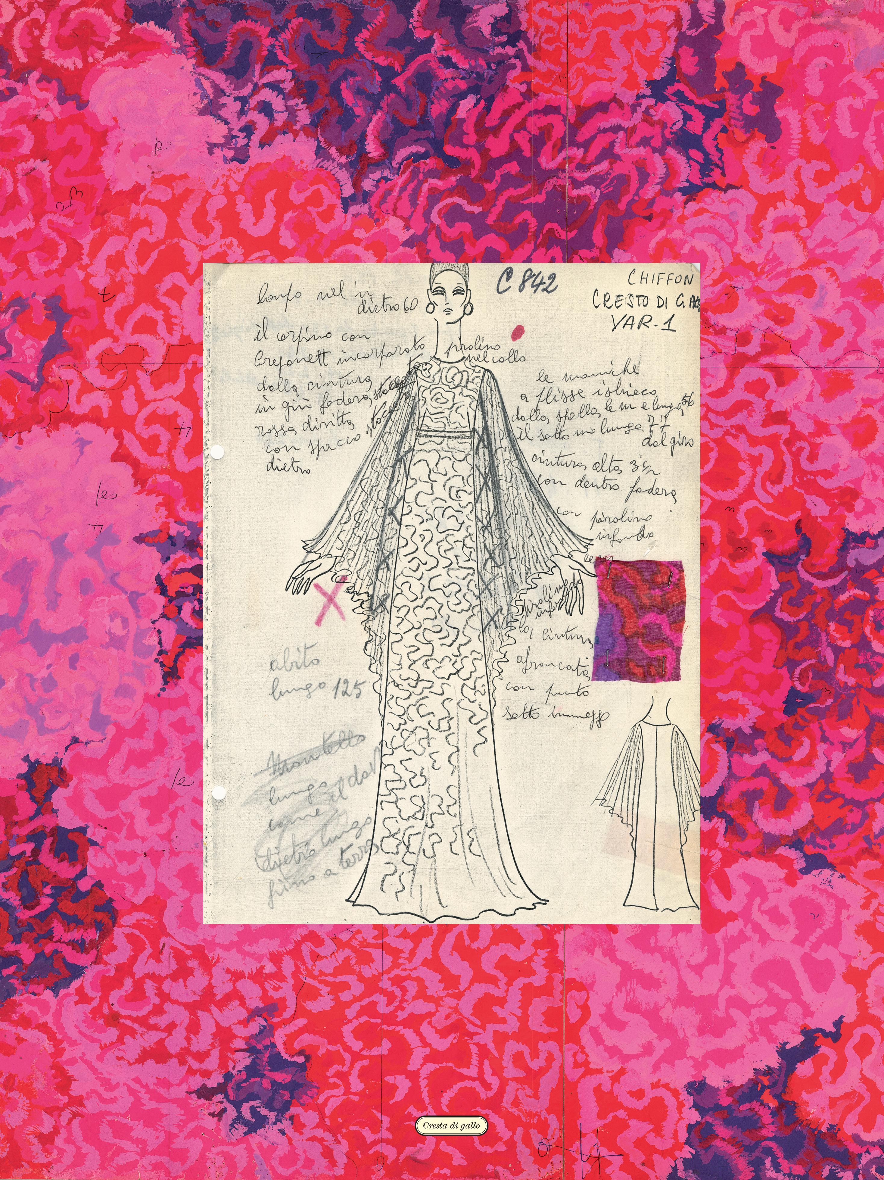 Bozzetto di abito pensato con tessuto Cresta di gallo, 1966 (Archivio Fondazione Ken Scott)