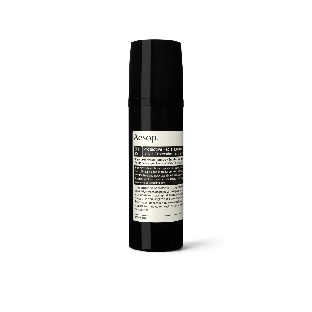 Parte della gamma Sun Care di Aesop, Protective Facial Lotion SPF50 offre una protezione UV ad alto livello e ad ampio spettro. Una lozione di texture media ideale per l’uso quotidiano, che idrata la pelle proteggendola dai raggi UVA e UVB. Adatta alla maggior parte dei tipi di pelle, in particolare a quelle da “normali” a secche, non unge e ha una lunga durata.