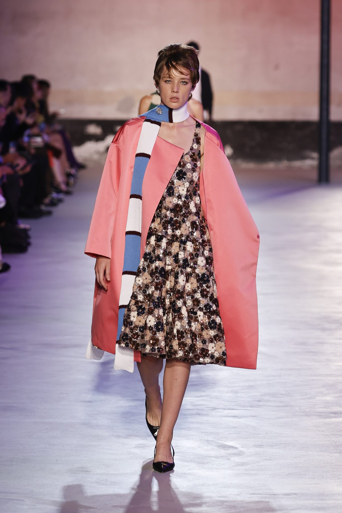 Acconciature moderatamente cotonate, ballerine appuntite, quadri optical in bianco e nero, ricami e bon-ton di matrice quasi couture sono solo alcuni dei chiari riferimenti a questa epoca affascinante. Ma come da sempre accade nell’estetica visionaria di Dell’Acqua il risultato finale non è mai una mera ricostruzione storica. La donna N° 21, elegante e sofisticata, reclama la propria identità, è una donna ribelle che rifiuta la banalità e le imposizioni.