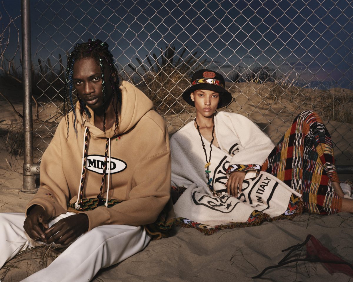 Nella collezione – in vendita sugli e-commerce di entrambi i marchi e in boutique selezionate – troviamo una nuova «melodia urbana» con tute e cardigan nelle classiche fantasie Missoni, accostate a magliette oversize arricchite da stampe spray. I pantaloni e le gonne si fanno invece dritti e morbidi, mentre i berretti, le sneaker, i sandali e le borse intensificano il sapore subculturale che permea la collezione.