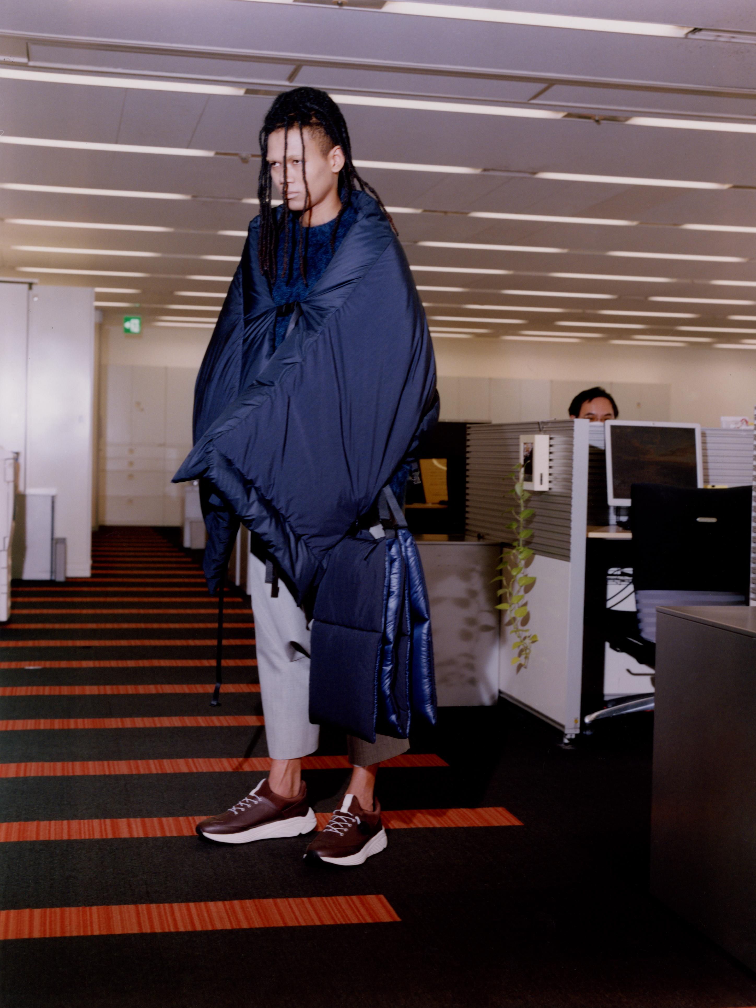 «Il design della moda è meno focalizzato sui consumatori che sul marketing». Questa dichiarazione rilasciata a Vogue durante una chiamata Zoom da Tokyo riassume l’animo della collezione di Fumito Ganryu. Capi comodi e soprattutto funzionali, come il piumino (che si chiude come un giubbotto salvagente) o la sciarpa imbottita. Una collezione che non si definisce unisex, ma ha tutto il fascino del crossover tra generi.
