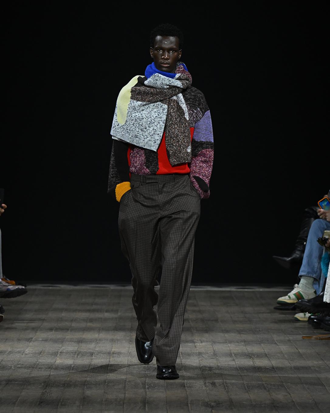 Brand francese emergente che trae ispirazione dall’arte visionaria e i movimenti creativi che hanno influenzato la società moderna, EGONLAB dedica la sua settima collezione a due leggende: Rene Glemarec e Vivienne Westwood. I capi in passerella diventano uniformi grunge della «scuola della vita», con pantaloni svasati e crop-top di taglio sartoriale. Mentre il disegno a rombi diventa emblema del tempo presente così come la sovrapposizione di colori che vive nei tagli e nelle stampe.