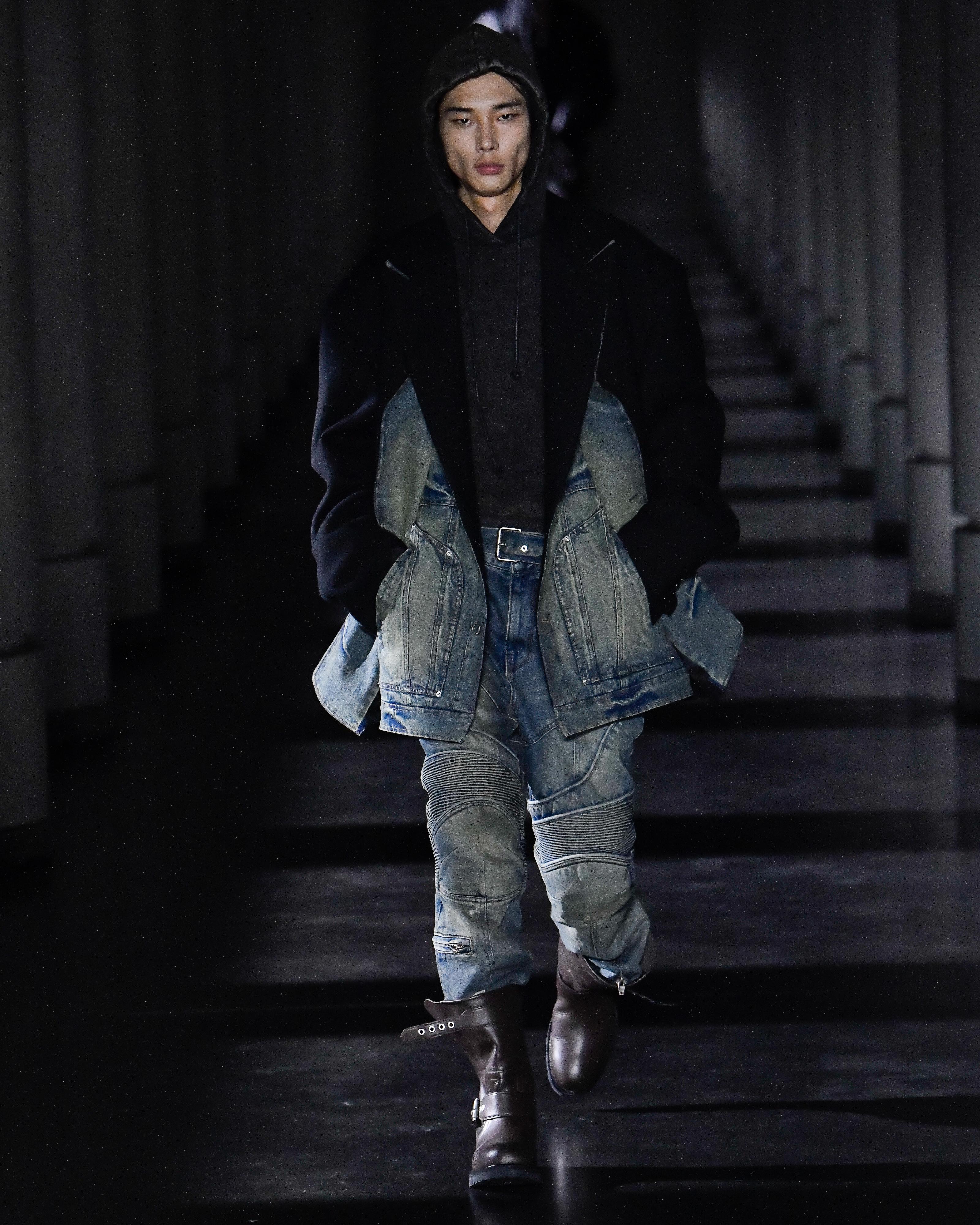 Nella sua nuova collezione, lo stilista coreano esplora l’universo del grunge. Giacche da motociclista macchiate di vernice, borse punteggiate da borchie affilate e abiti strappati e ricuciti. Juun J. gioca con le sovrapposizioni e i tagli per «mostrare la bellezza in qualcosa di danneggiato».