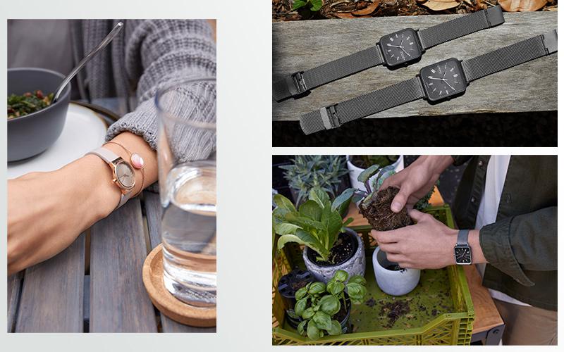 Diverse le colorazioni e i cinturini in maglia, dall’elegante equilibrio fra artigianalità ed ecologia.